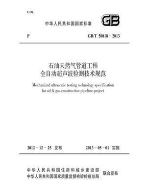 本规范由中华人民共和国住房和城乡建设部第1581号公告批准,编号为GB50818-2013,自2013年5月1日实施。 本规范适用于低碳钢或低合金钢、6mm~50mm管道壁厚、大于100mm公称直径、环向对接接头的石油天然气管道工程的全自动超声波现场检测与质量评定。